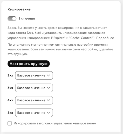 Здесь вы можете указать время кэширования в зависимости от кода ответа (2xx, 3xx, 4xx, 5xx) и установить игнорирование заголовков управления кэшированием ("Expires" и "Cache-Control").
