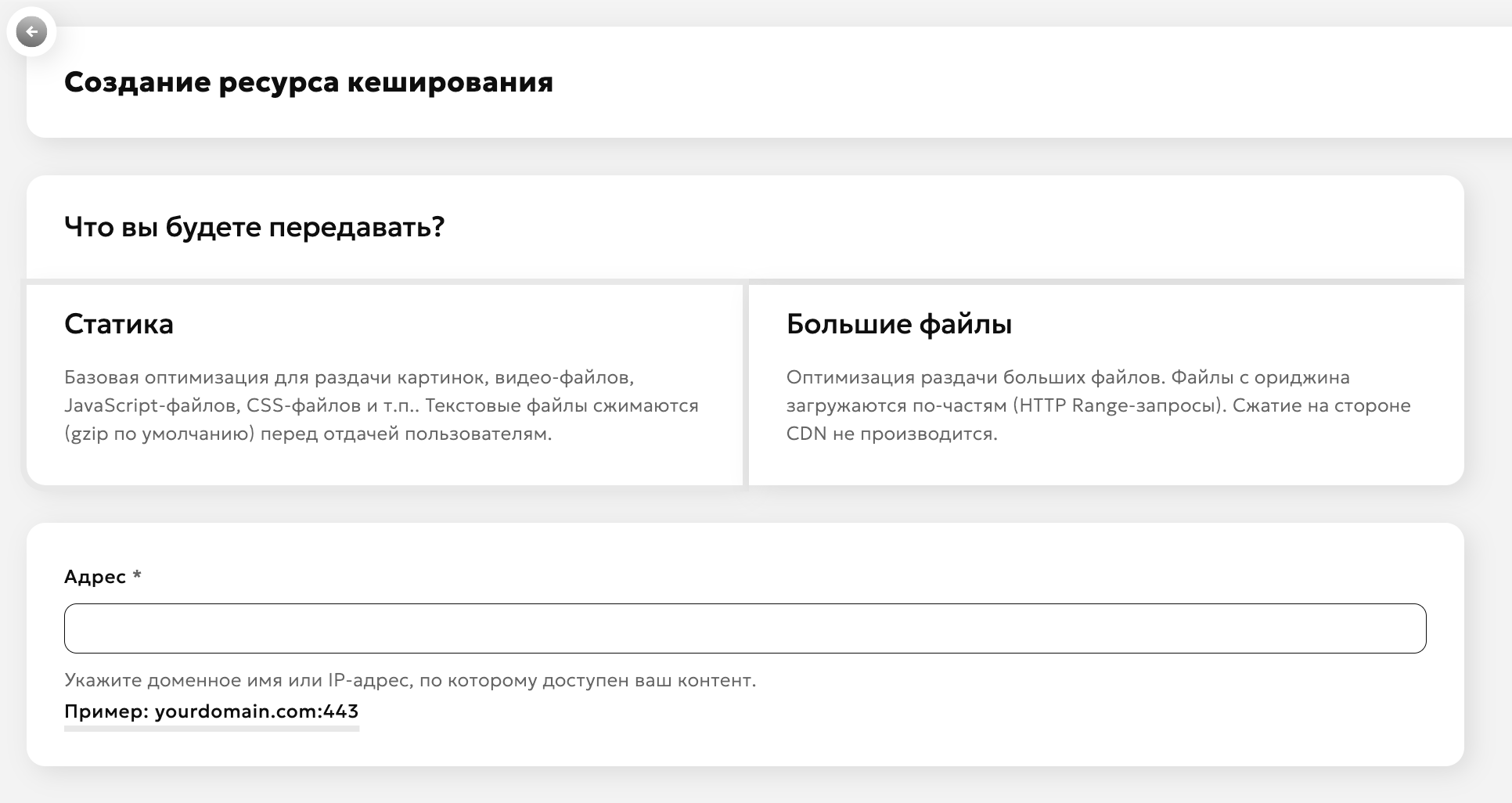 При создании ресурса необходимо выбрать один из вариантов оптимизации раздачи контента: