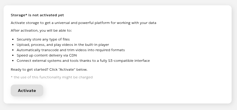 To get started, select the "Storage" section in the side menu. When using it for the first time, you need to initialize the service by clicking the "Activate" button.